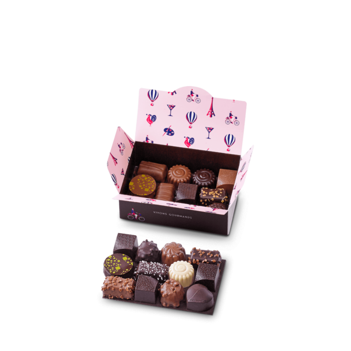 Retrouvez avec cet assortiment de chocolats au lait, noirs et blancs une véritable palette de saveurs : des ganaches onctueuses, des pralinés torréfiés à cœur, pâtes d'amandes, nougatines et bien d'autres à découvrir. Créés et fabriqués en France à partir des ingrédients les plus fins, les chocolats de Neuville raviront tous les palais avec des recettes classiques comme des plus originales. Toute la force et la douceur d’un chocolat de qualité pour succomber à la tentation et partager un agréable moment chocolaté. Un joli cadeau chocolaté pour soi ou pour ceux qu’on aime. Pensez également à nos ballotins de chocolats pour vos cadeaux d'affaires, un geste qui sera apprécié par le plus grand nombre.