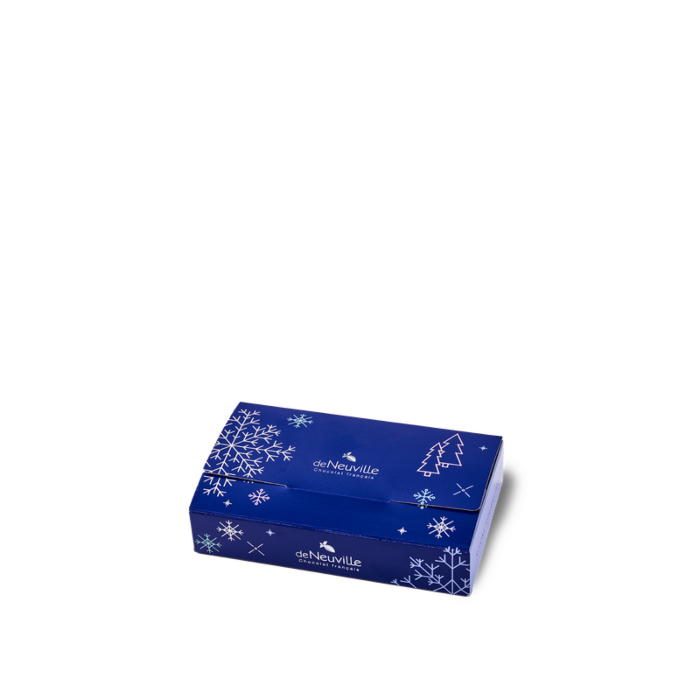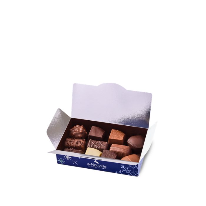 Plongez dans l'univers gourmand de De Neuville avec notre Ballotin de Noël 110g. Ce ballotin est une véritable symphonie de saveurs, alliant ganaches infusées aux parfums délicats et pralinés torréfiés à cœur. Chaque chocolat est une œuvre d'art, avec des éclats de biscuits, noisettes, nougatine, et amandes, créant une expérience gustative inoubliable. Parfait pour les fêtes de Noël, il apporte une touche de magie à vos célébrations. Commandez en ligne pour une livraison rapide à domicile ou surprenez vos proches en envoyant ce délice. Nos boutiques, présentes partout en France, vous accueillent chaleureusement pour découvrir nos créations. Profitez du click&collect pour un retrait pratique et rapide, et faites de chaque moment un instant magique. Ce ballotin est également idéal pour offrir à vos clients ou salariés, ajoutant une touche de gourmandise à vos cadeaux d'entreprise.