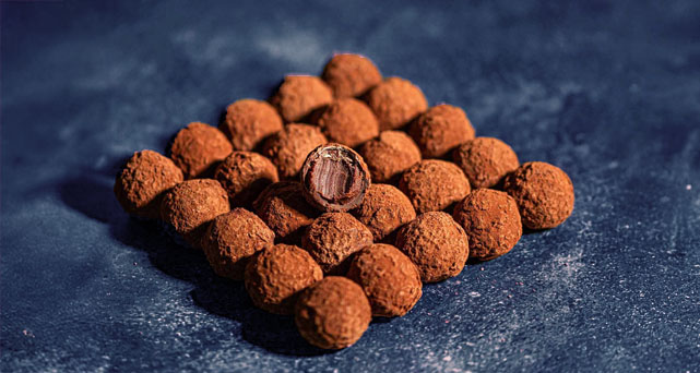 Ganache noire corsée aux fins éclats de fèves de cacao dans une coque noire
