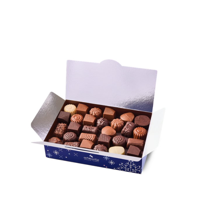 Le Ballotin de Noël 580g est le cadeau parfait pour les fêtes. Composé de chocolats d'une finesse exceptionnelle, il inclut des ganaches aux parfums variés et des pralinés aux amandes et éclats de biscuits. Idéal pour les fêtes de Noël, il transforme chaque instant en un moment de plaisir gourmand. Commandez en ligne pour une livraison à domicile ou visitez nos boutiques De Neuville pour une expérience chocolatée unique. Profitez du click&collect pour un retrait pratique et rapide, et laissez-vous séduire par l'art du chocolat français. Ce ballotin est également une excellente option pour vos cadeaux d'entreprise, apportant une touche de raffinement à vos relations professionnelles.
