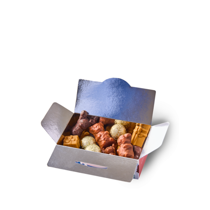 Ingrédients : sucre, beurre de cacao, LAIT entier en poudre, sirop de glucose, NOISETTES, pâte de cacao, AMANDES, pâte de NOISETTE, LACTOSERUM en poudre, eau, BEURRE, LACTOSE, matière grasse LAITIERE, dextrose, sucre glace, émulsifiant : lécithine (SOJA), huile d'AMANDE raffinée, farine de BLE, protéines de LAIT hydrolysées, gélifiant : gélatine (porc), LAIT écrémé en poudre, poudre de cacao, arôme naturel de vanille, sel, BEURRE concentré, malt d'ORGE, vanille en poudre. Traces possibles : œufs, autres fruits à coque, arachide, sésame, moutarde. Fèves de cacao origine hors UE. Chocolat au lait : 30% de cacao minimum. Les chocolats en forme de billes ne conviennent pas aux enfants de moins de 3 ans.