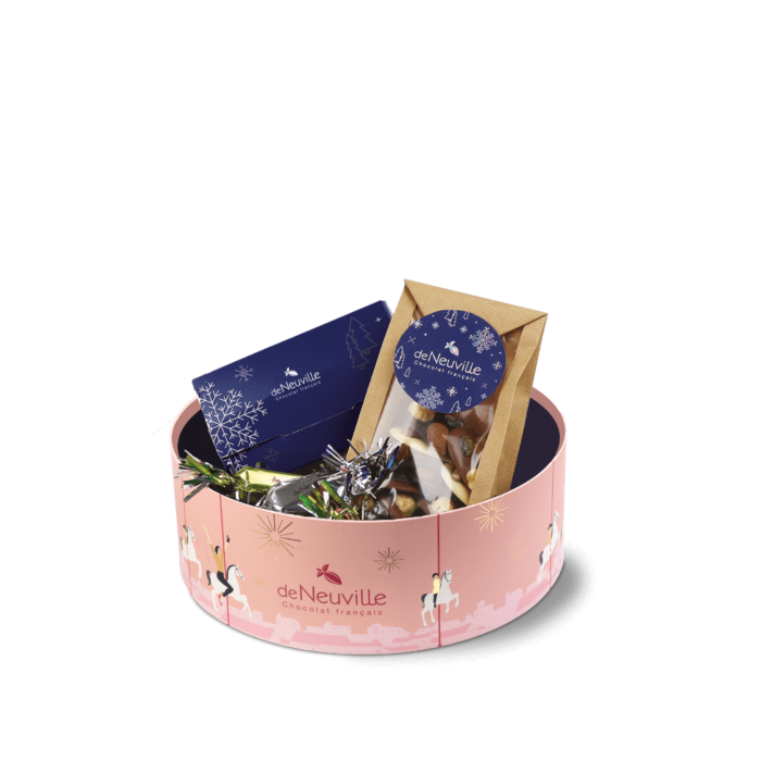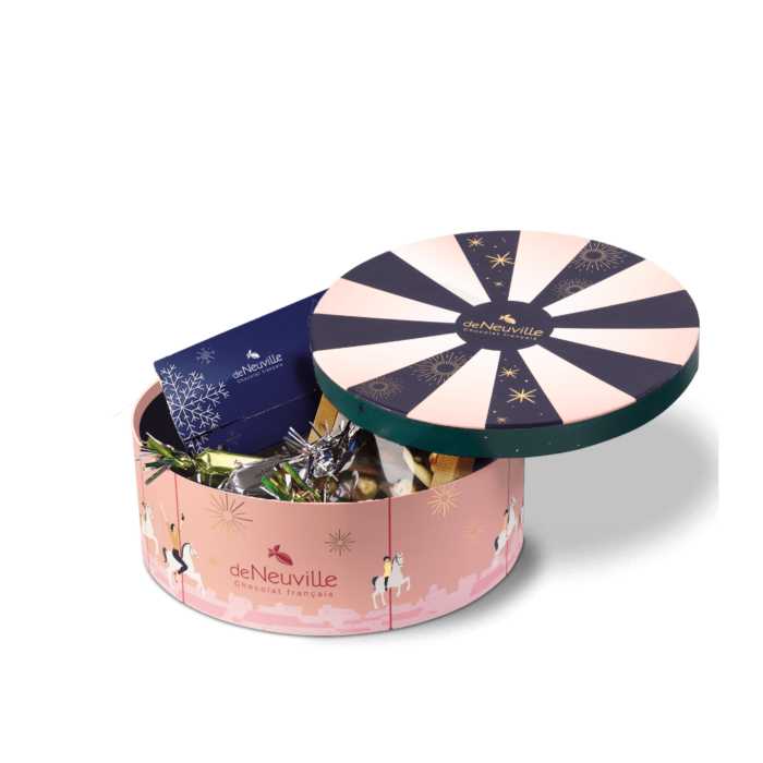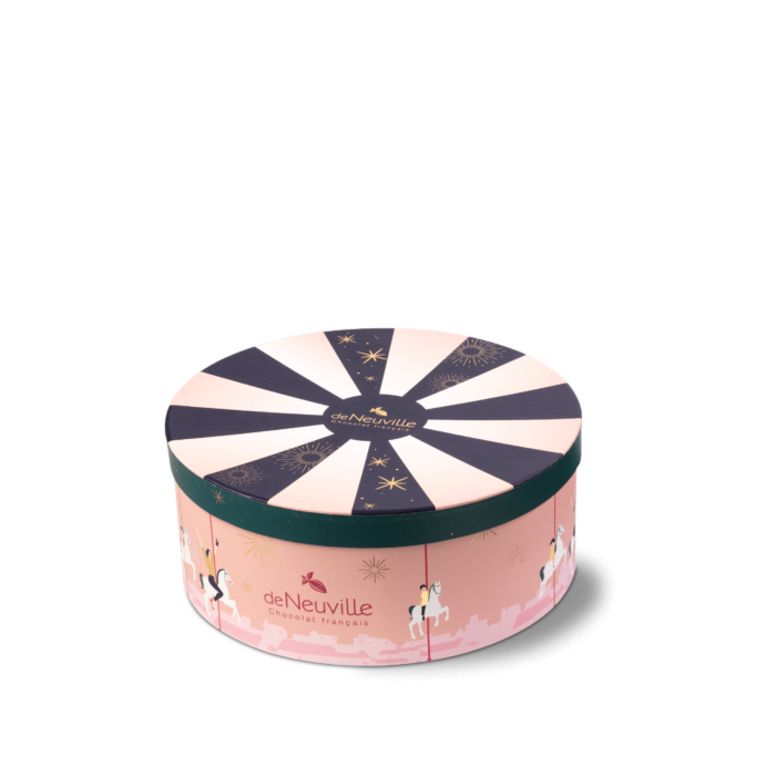 Tournez manège, les plaisirs gourmands vous attendent ! Notre Boîte Carrousel Garnie de Noël De Neuville est une véritable attraction. Elle renferme un ballotin de chocolats de 110g, un mélange de pralinés et de fines ganaches aux recettes traditionnelles ou originales, un sachet de mendiants croquants et des papillotes pleines de surprises. Le tout présenté dans une magnifique boîte en forme de carrousel, une invitation à la rêverie et à la gourmandise. Un cadeau de Noël enchanteur, idéal pour offrir du chocolat et faire voyager les papilles. Retrouvez cette merveille dans nos boutiques de chocolat !