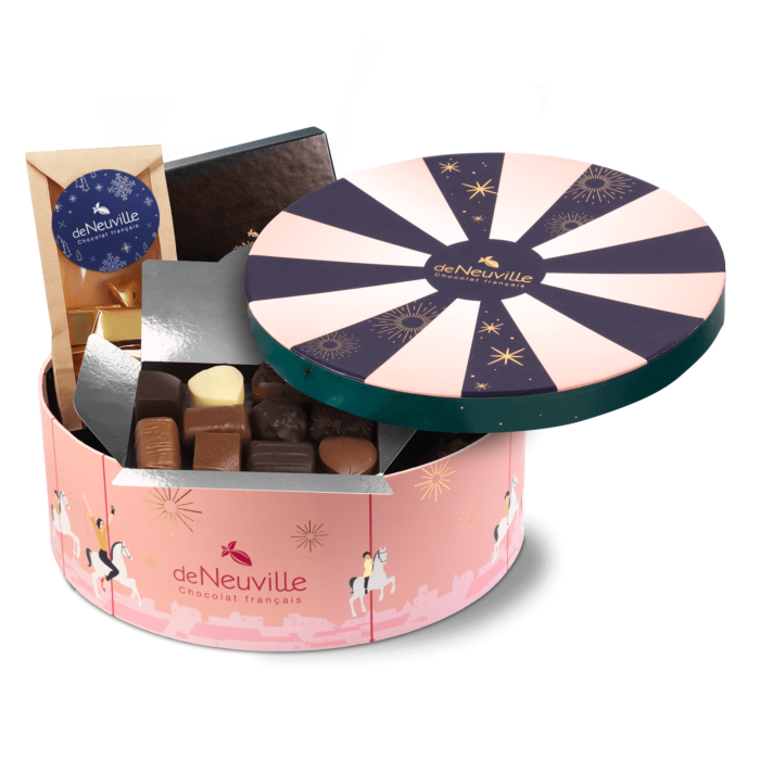 Tournez manège, les plaisirs gourmands vous attendent ! Notre Boîte Carrousel Garnie de Noël De Neuville est une véritable attraction. Elle renferme un ballotin de chocolats de 220g, un mélange de pralinés et de fines ganaches aux recettes traditionnelles ou originales, un coffret de truffes véritables de 140g, un coffret de 9 ganaches de 90g, un sachet de gianduja de 150g et un message en chocolat "Joyeuses Fêtes" Le tout présenté dans une magnifique boîte en forme de carrousel, une invitation à la rêverie et à la gourmandise. Un cadeau de Noël enchanteur, idéal pour offrir du chocolat et faire voyager les papilles.-
