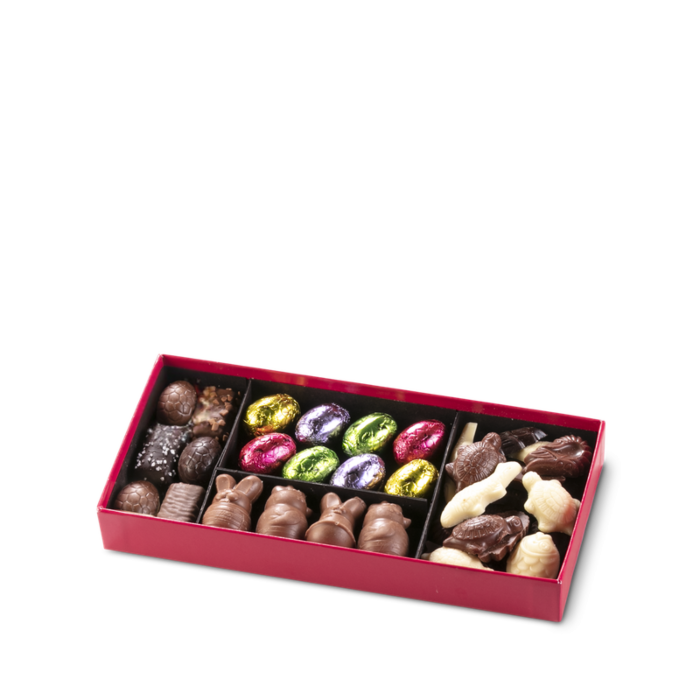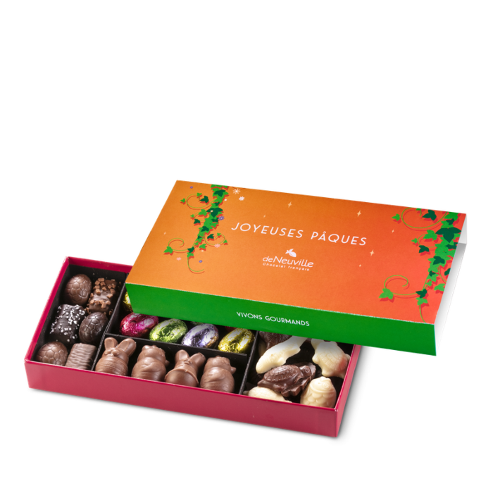 Pour une fête de Pâques réussie en famille, partagez un instant gourmand autour de notre coffret de Pâques. Un assortiment composé d'œufs fourrés en chocolat noir, lait ou blanc, de petites fritures de Pâques et de bouchées au praliné noisettes !