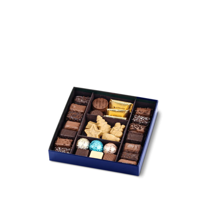 Plus grand, mais toujours aussi festif ! Notre Moyen Coffret de Chocolats Festifs De Neuville est le compagnon idéal pour célébrer un Noël gourmand. Dans son écrin aux couleurs chatoyantes des fêtes, découvrez un assortiment généreux de bonbons de chocolats (pralinés et ganaches de notre gamme "Tellement Français"), des boules en chocolat au lait et noir, des giandujas fondants et de petits chocolats blonds pour une touche d'originalité. Chaque coffret est une surprise ! Un coffret de chocolat parfait pour offrir du chocolat en grand, idéal pour vos cadeaux de Noël à destination de vos proches, clients ou salariés.-