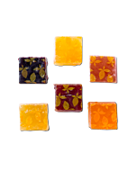 Ingrédients : purées de fruits (ananas, cassis, fraise, mandarine, poire, groseille), sucre, sirop de glucose, gélifiant : pectine, arômes naturels (ananas, fraise, cassis, mandarine, poire), jus de citron concentré, épaississant : gomme arabique, beurre de cacao, colorants : E100, E163, cacao en poudre. Traces possibles : arachide, œufs, lait, soja, gluten, fruits à coques. Purée de fruits: origine U-E et hors U-E.